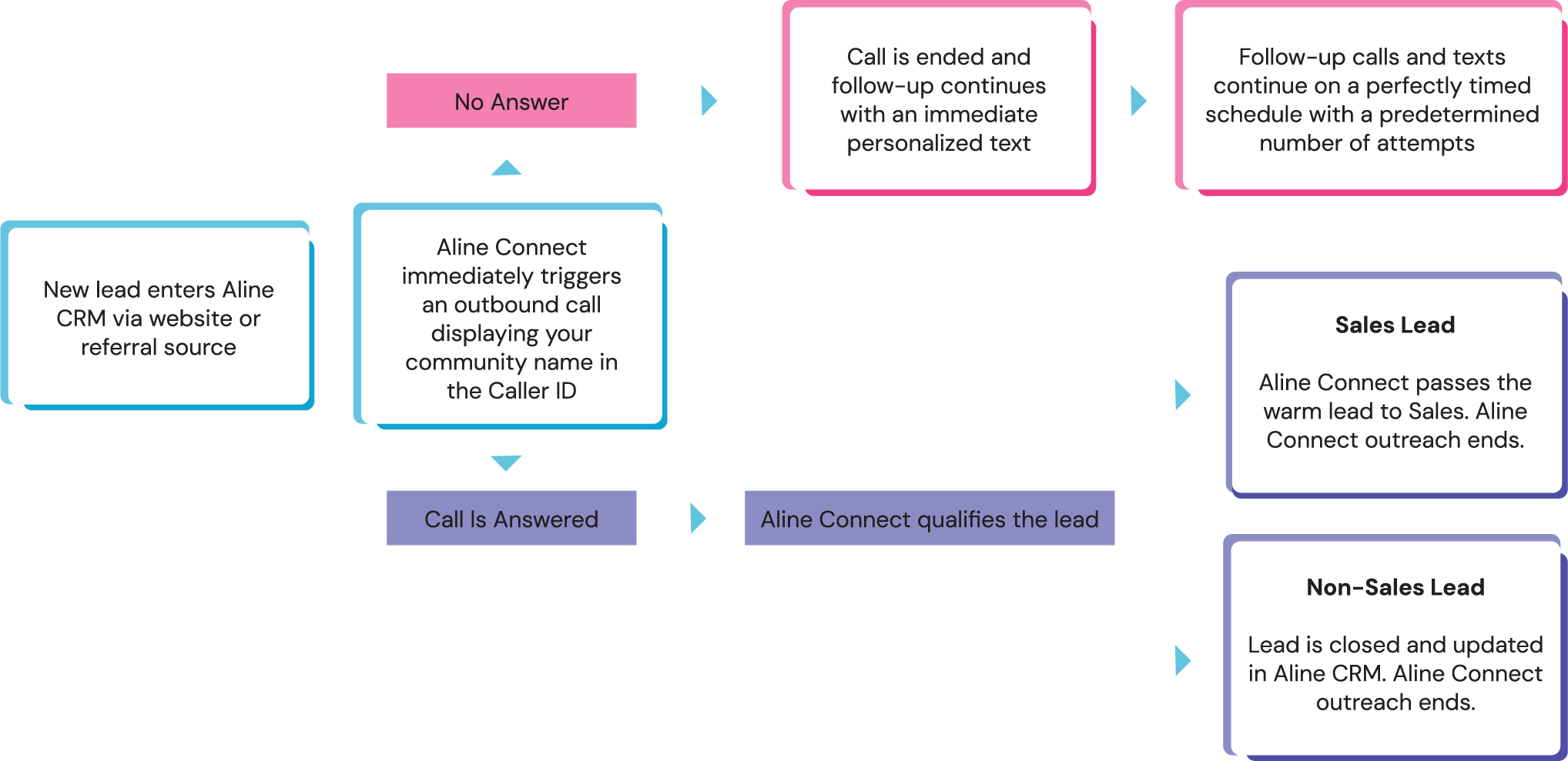 Yes, it is a seamless experience! Inbound leads automatically populate in Aline CRM and Aline Connect begins outreach immediately. All activities, call, and text messages are logged in the CRM for complete visibility.
